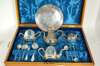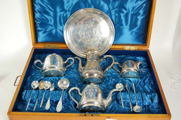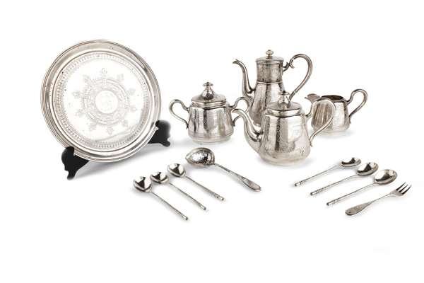 Vasily Ikonov, Moscow circa 1883, comprising; a coffee pot; teapot; sucrier and cover; cream jug; six spoons; a small fork; a sugar sifter and a similarly decorated tray, all decorated with geometric framework, engraved monogram, contained in a fitted case