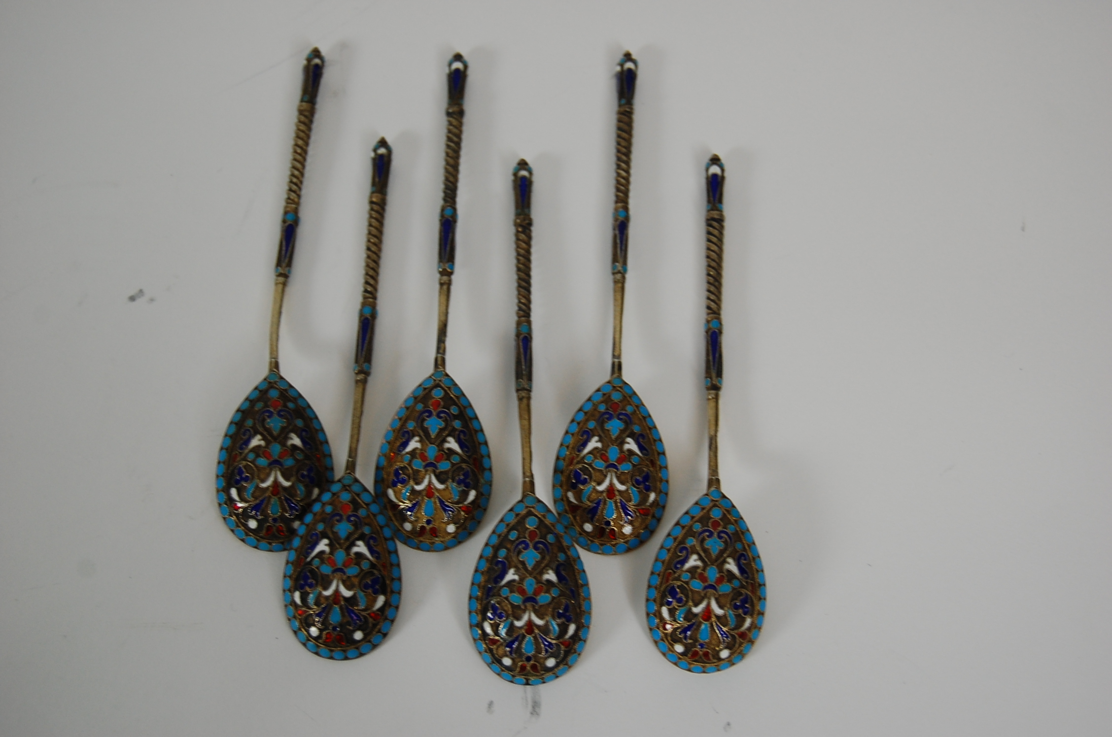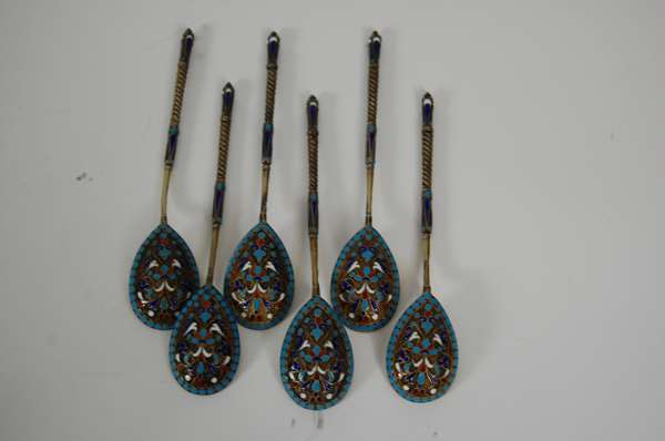 Moscow circa 1899, maker GK, shaped gilt bowl with enamel back panelled and wrythen stem panelled knop; together with a larger mixing spoon, Moscow 1899-1908, similarly decorated to previous set; a sugar sifter, Moscow 1899, DT in cyrillic, enamelled wavy handle, pierced trellis work decorated bowl