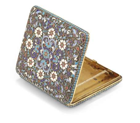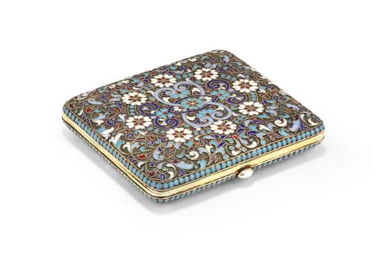 A Russian silver gilt and champlevé decorated cigarette case