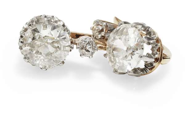 Length 1.5cm, estimated principal diamond weights 1.37cts and 1.25cts, smaller diamonds estimated to weigh: 0.12cts and 0.12cts. Estimated average diamond grades: colour I-K; clarity SI2-P1. However