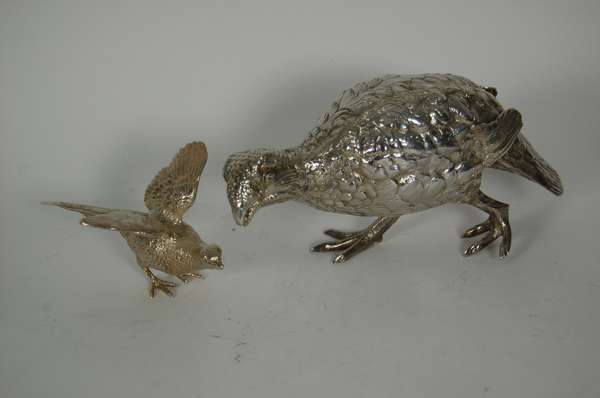 London 1966, formed as a cock and hen pheasant; together with a larger table ornament of a grouse, London 1966 of similar form (3)