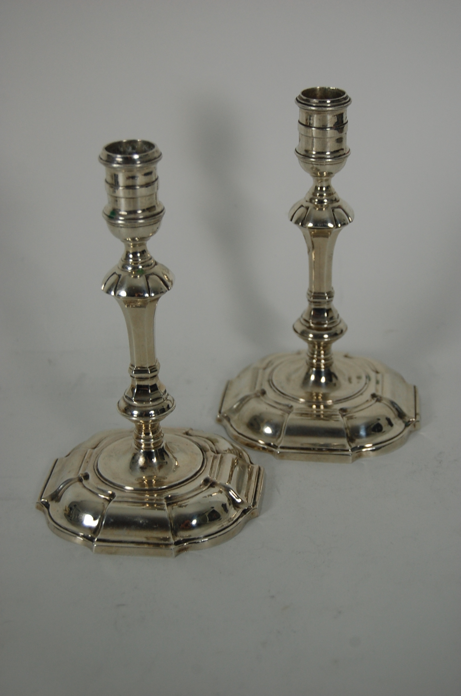 N Bros, London 1985, the simple socket sconce, above knopped and tapered facetted stem, raised on domed stepped spreading foot (2)