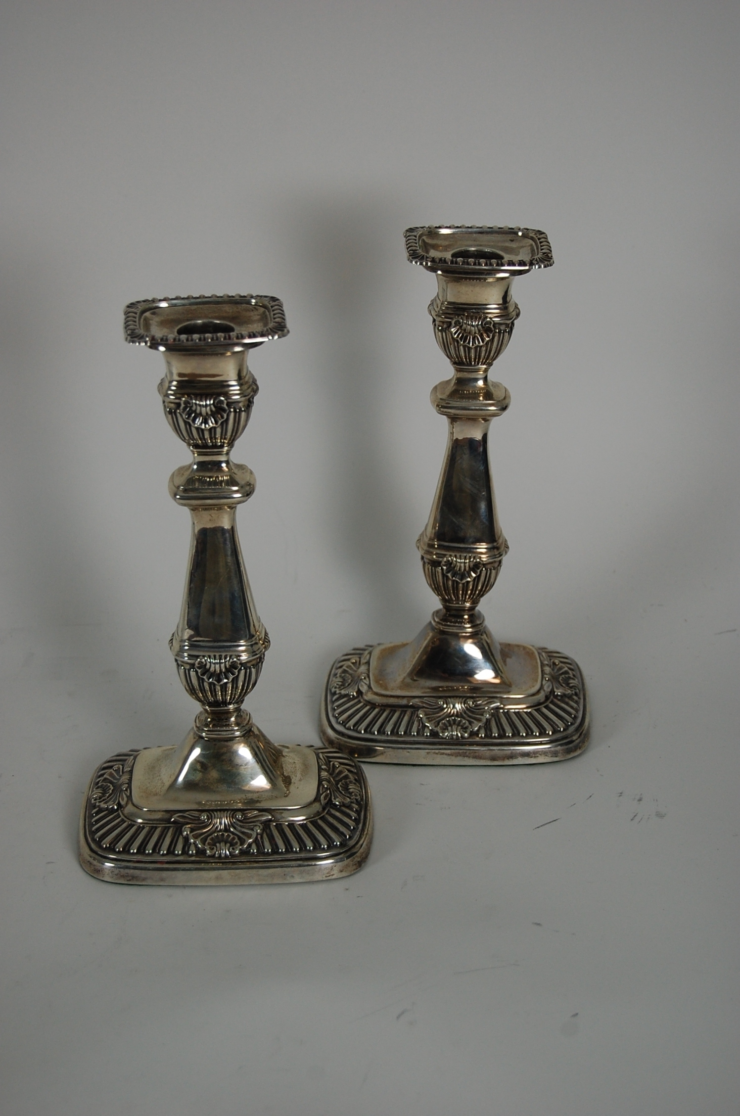 T Bradbury & Sons, Sheffield 1918, the sconces above tapered baluster stem and on spreading rectangular base, with gadrooned and shell borders and detail (2)
