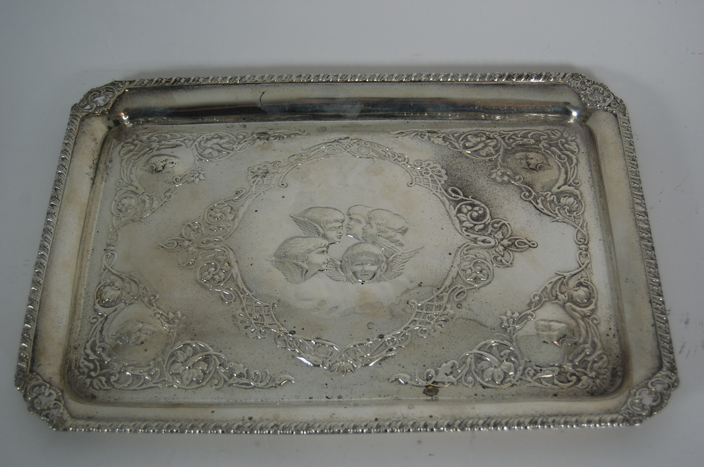 comprising rectangular tray with gadrooned rim and pierced corners, two clothes brushes, hand mirror and comb, each with embossed designs of winged cherubs in floral and scroll borders (5)