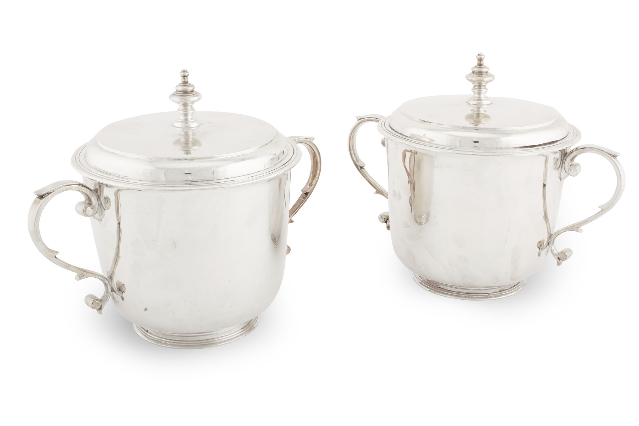 retailed by Tessiers London 1930, with deep plain slightly flared bowls on reeded stepped foot, with twin S scroll handles with plain thumb piece, with lift off covers with urn type finial (2)