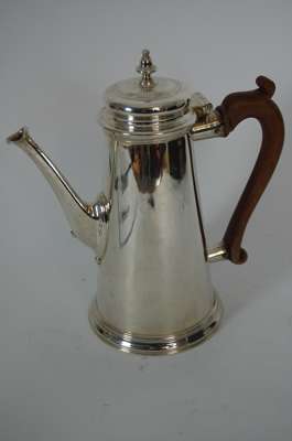 retailed by Tessiers, London 1930, of flared form with reeded foot and facetted straight spout, and S scroll wooden handle, the domed hinged cover with urn finial