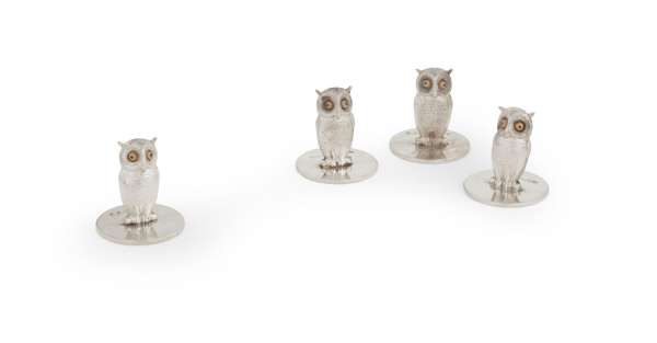 Samson Morden & Company, Chester 1906, each naturalistically formed as an owl with glass eyes, with clip fitting to reverse and on plain circular bases, contained in fitted case