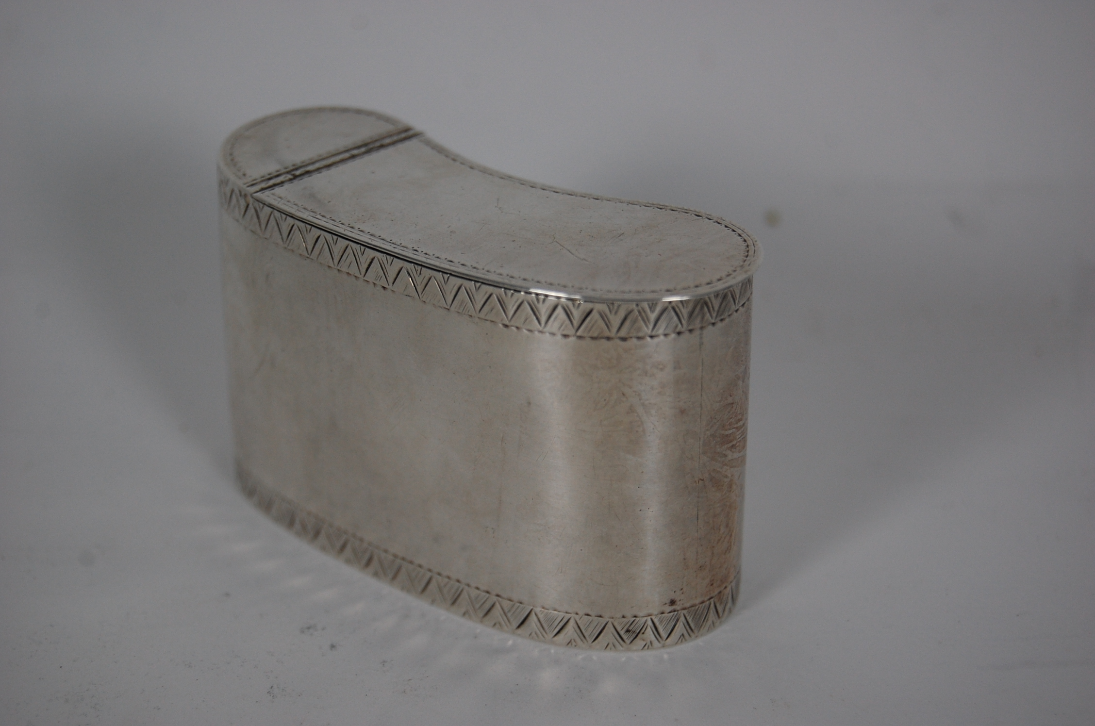 makers mark IR, London 1793, of curved kidney section with simple straight sides, the foot and rim with zig zag engraved borders, and the three quarter opening flush lid with simple wriggle border and hinge detail