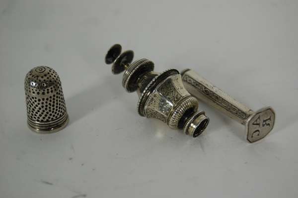apparently unmarked, the five stage body with screw off thimble enclosing bobbin, the central section a screw off box with tapered octagonal stemmed needle case terminating in canted square seal matrix with initials AC/R, the whole with engraved panels and borders