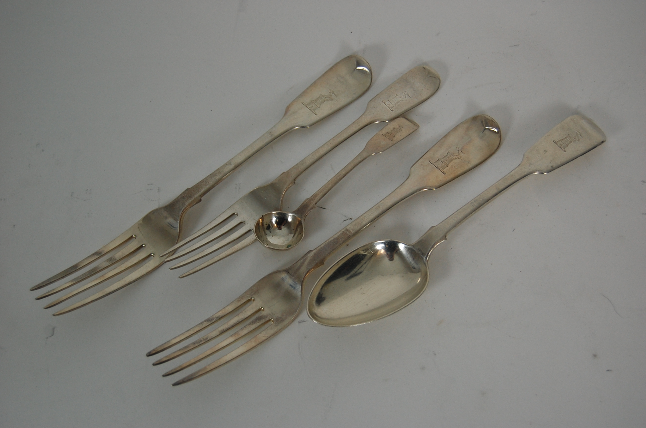 mainly W Ealey and London circa 1838, of Fiddle pattern with engraved crest to terminal to include; fourteen table forks, fourteen dessert forks, twenty three dessert spoons, sixteen teaspoons, one jam spoon and five salt spoons (qty)