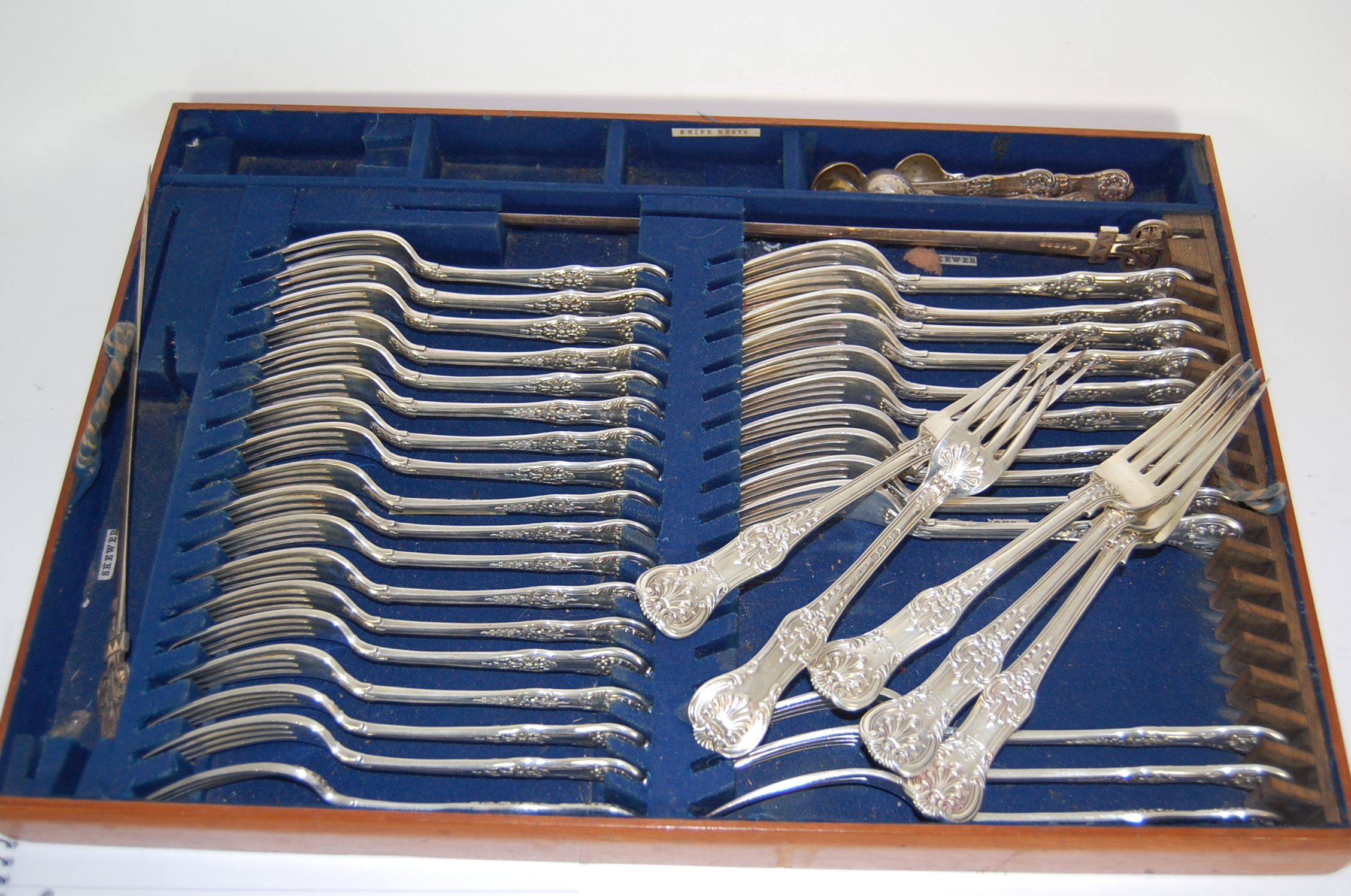 mainly G Adams London 1853, contained in a mahogany canteen with lift out trays, comprising: eighteen dessert and tablespoons; twenty two teaspoons; twenty three table forks; twenty four dessert forks; together with various silver plated nut crackers, skewers etc, the lower level fitted with fruit and berry spoons; cauldron salts and spoons; and open mustards by various makers and patterns (qty)