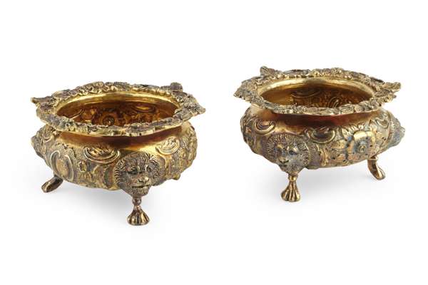 R Hennell, London 1860 and D & C Houle 1850, each of large open form with shell scroll and foliate everted rims and bodies with embossed and chased foliate decoration with three lion mask paw feet (2)