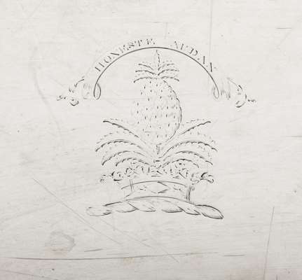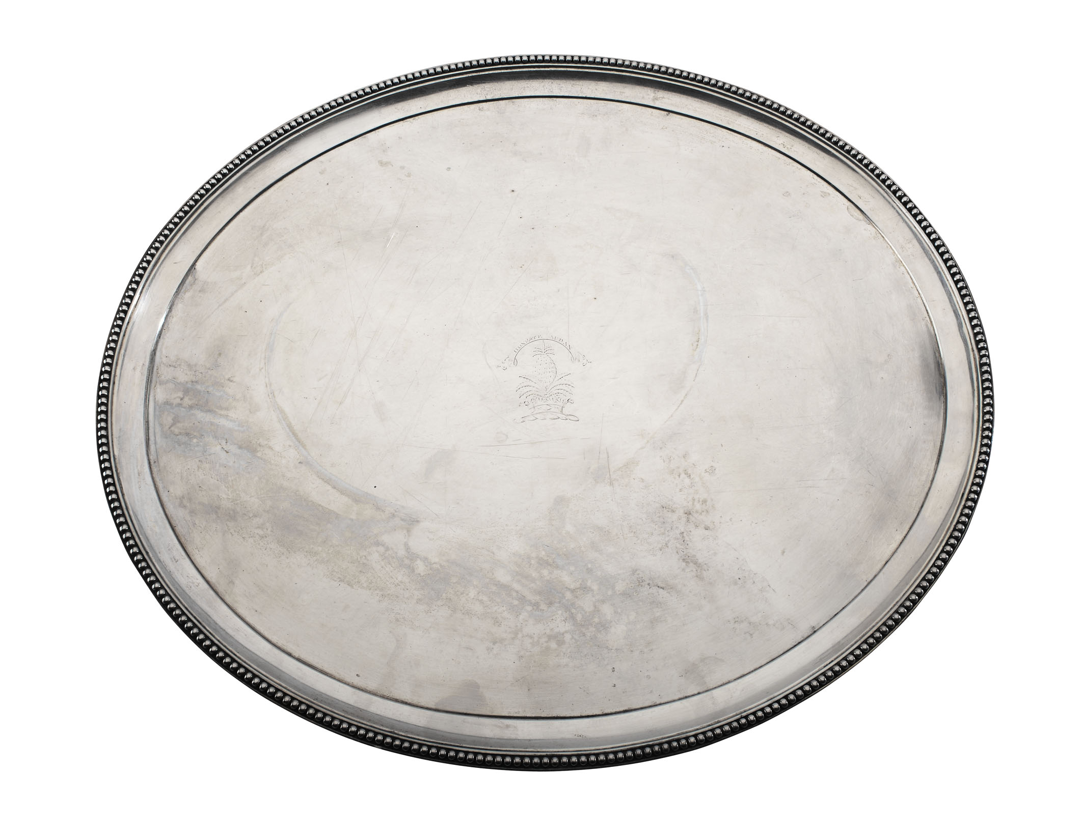 J Wakelin & W Taylor, London 1786, of oval outline with beaded border, the centre engraved with a crest, raised on four bracket feet with beaded borders and with engraved initials and scratch weight to underside