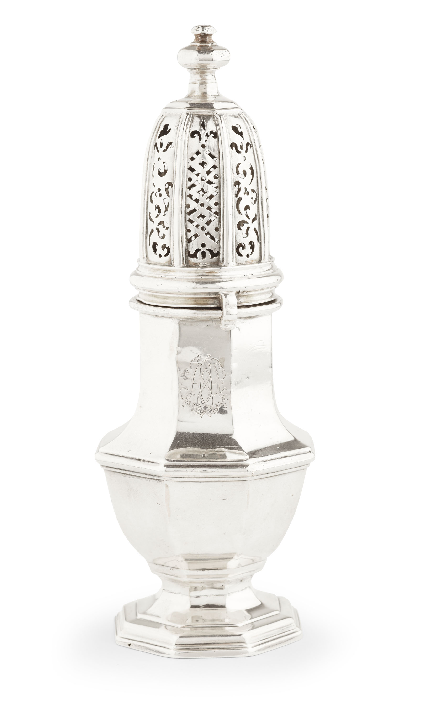 Anthony Nelme, London circa 1720, struck makers mark only four times, the octagonally panelled body of baluster form with engraved monogram and moulded girdle and rims, on waisted stem with spreading foot, the bayonet fitted domed cover with alternate panels of pierced lattice work and scrolls between applied strap work, with octagonal urn finial