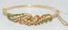 the hinged stiff bangle with a scrolling pearl set motif with central pearl set flower head,accentuated by two graduated rows of demantoid garnets, all in a hinged case