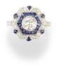millegrain collet set to the centre with a round brilliant cut diamond, within a hexagonal border, channel set with French cut sapphires, with outer hexagonal border set with round brilliant cut diamonds interspersed by fancy kite cut sapphires, flanked to each shoulder by three round brilliant cut diamonds, with foliate pierced gallery, shank stamped 18K