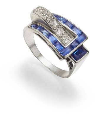 of pierced geometric design, set with borders of graduated round brilliant and single cut diamonds and rectangular cut sapphires