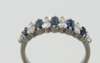 of graduated design, alternately claw set with pairs of round brilliant cut diamonds and baguette cut sapphires, additionally set to each shoulder with a single similarly cut diamond