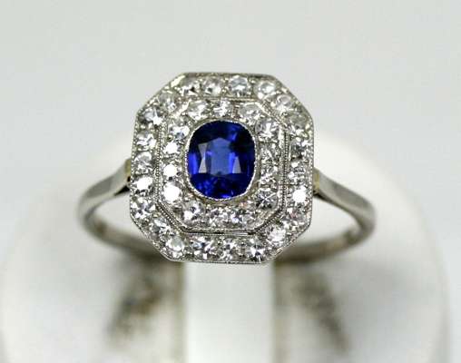 millegrain collet set to the centre with an oval cut sapphire, within an octagonal surround millegrain set with two rows of single cut diamonds Height of ring to front 1.3cm