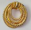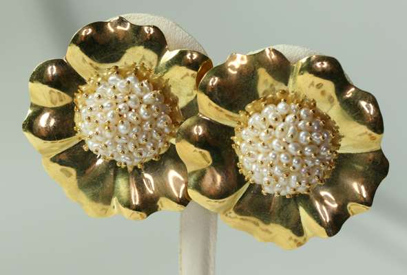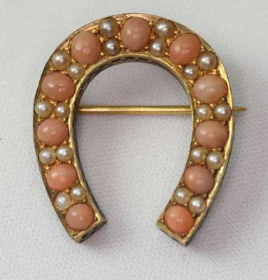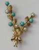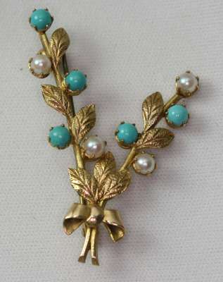 to include a foliate spray brooch, set with circular cut turquoise cabochons and half-pearls; a coral and half-pearl set horseshoe shaped brooch; a pair of floral pins, each set to the centre with a cluster of seed pearls; also a gilt metal shaped oval clip (4)