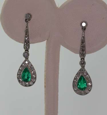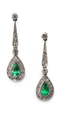 each composed of a millegrain collet set round brilliant cut diamond, surmounting a single cut diamond set tapering drop, suspending an ovoid cluster set to the centre with a pear cut emerald within a border of single cut diamonds, with post and butterfly fittings, settings stamped 18ct PLAT