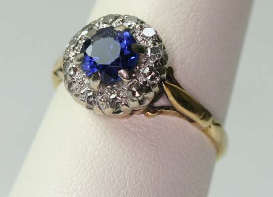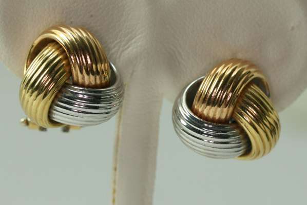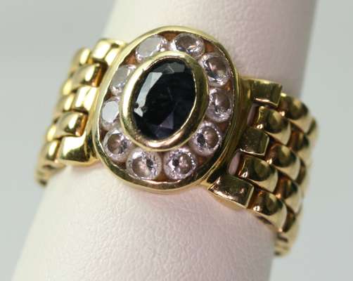 claw set with a circular cut sapphire, within a surround of single cut diamonds; another ring, composed of flexible brick form links, collet set to the front with an oval cut sapphire, within a surround of circular cut colourless gems, stamped 750; together with a pair of three-coloured knot form earrings, with post and hinged clip fittings, stamped 750 (3)