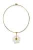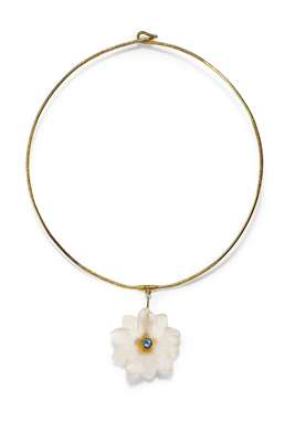 the textured torque form necklace with simple hooked clasp, suspending a detachable pendant, composed of carved rock crystal flowerhead with frosted finish, claw set to the centre with a circular cut blue zircon