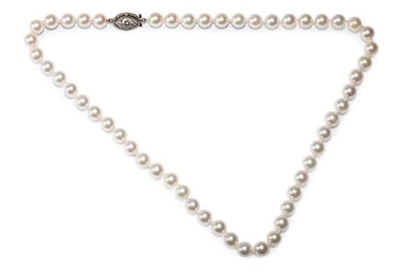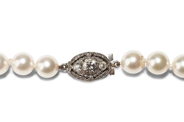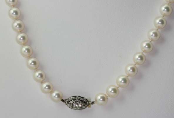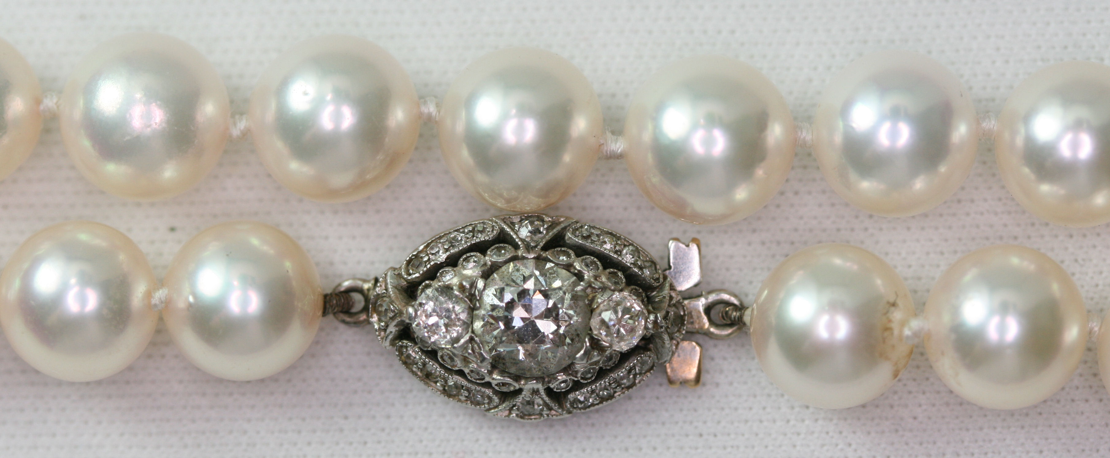 the necklace composed of uniform pearls, each measuring approximately 8mm diameter, the oval clasp set to the centre with an old European cut diamond, flanked to either side by a smaller old mine cut diamond, within borders of single cut diamonds, with foliate engraved decoration to the reverse