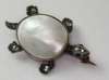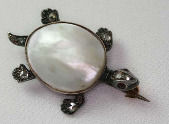 designed as a turtle, with ovoid high-domed shell cabochon body, with circular cabochon cut ruby set eyes and rose cut diamonds to the head, feet and tail