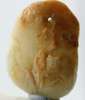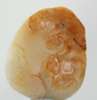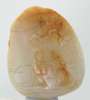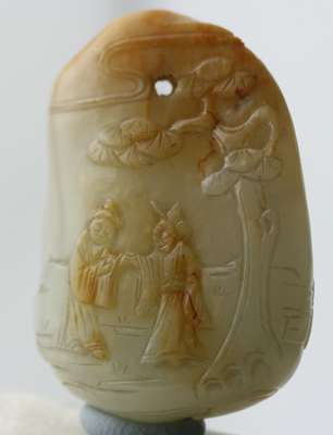 of shaped oval outline, carved to one side with a crouching figure and a horse beneath a tree, the other side carved with a courting couple beneath a tree, with drilled hole to the upper edge