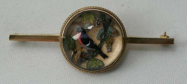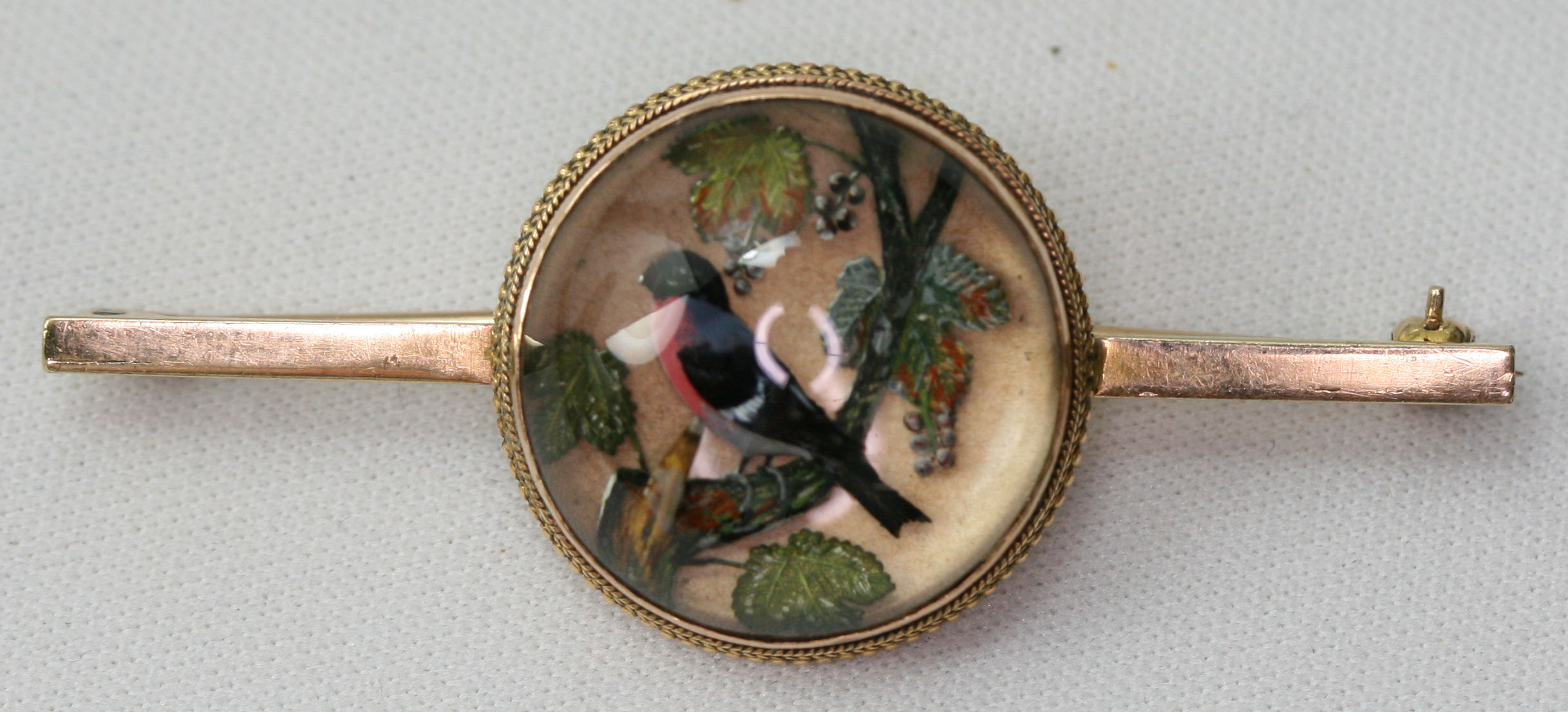 the plain slim bar applied to the centre with a circular reverse painted crystal intaglio brooch, depicting a bird on a branch, within ropewtwisted borders