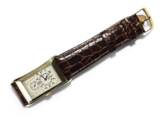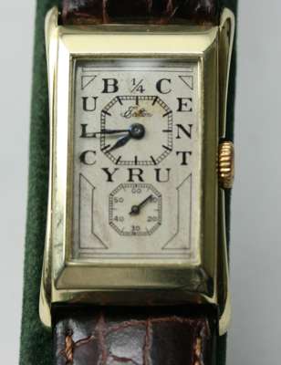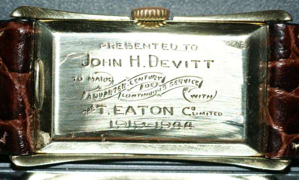 the 14k gold case with a rectangular face, split dials the main dial spelling '1/4 CENTURY CLUB' and inscribed 'Eaton' to the centre, subsidiary seconds dial, the movement inscribed 'Rolex Ultra Prima' case back engraved 'ROLEX 31 VICTOIRES De HAUTE PRECISION' numbered 53954 1490. The rear of the case engraved inscription ' Presented to John H Devitt to mark a Quarter Century of Continuous Service, with the T Eaton Co. Ltd., 1919-1944'