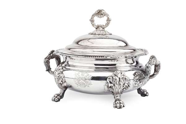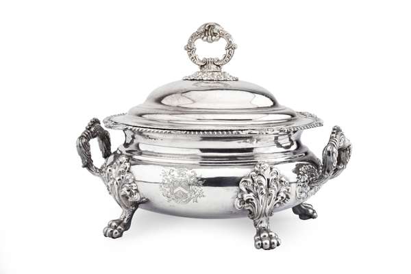 of oval outline the baluster body with engraved armorial, the everted gadrooned rim with shell detail, the twin handles with acanthus detail, raised on four large foliate and paw feet, the pull off domed cover with acanthus loop handle