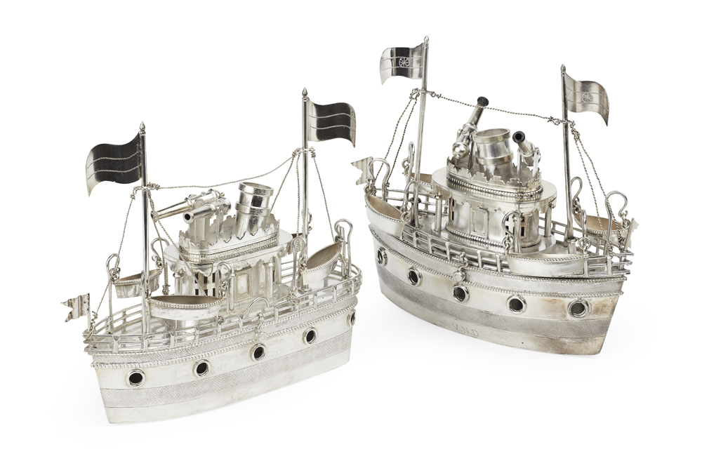 unmarked, each modelled with masts and rigging and with vacant port holes, the decks lifting off, with some gilt details (2)