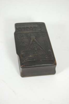 of rectangular form, the hinged cover with finely pressed masonic symbols and shaped thumbpiece
