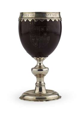 unmarked, the deep coconut shell bowl with engraved armorial sheild, with applied scalloped rim inscribed 'James Graham obyt 1650', the interior of bowl silver gilt lined, raised on a knopped stem with spreading foot with scalloped rim