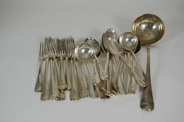 mainly London 1857 to comprise twelve tablespoons, eleven desert spoons, eighteen tableforks, eleven desert forks, two sauce ladles, soup ladle, salad servers, and match silver plated salt spoons (qty)