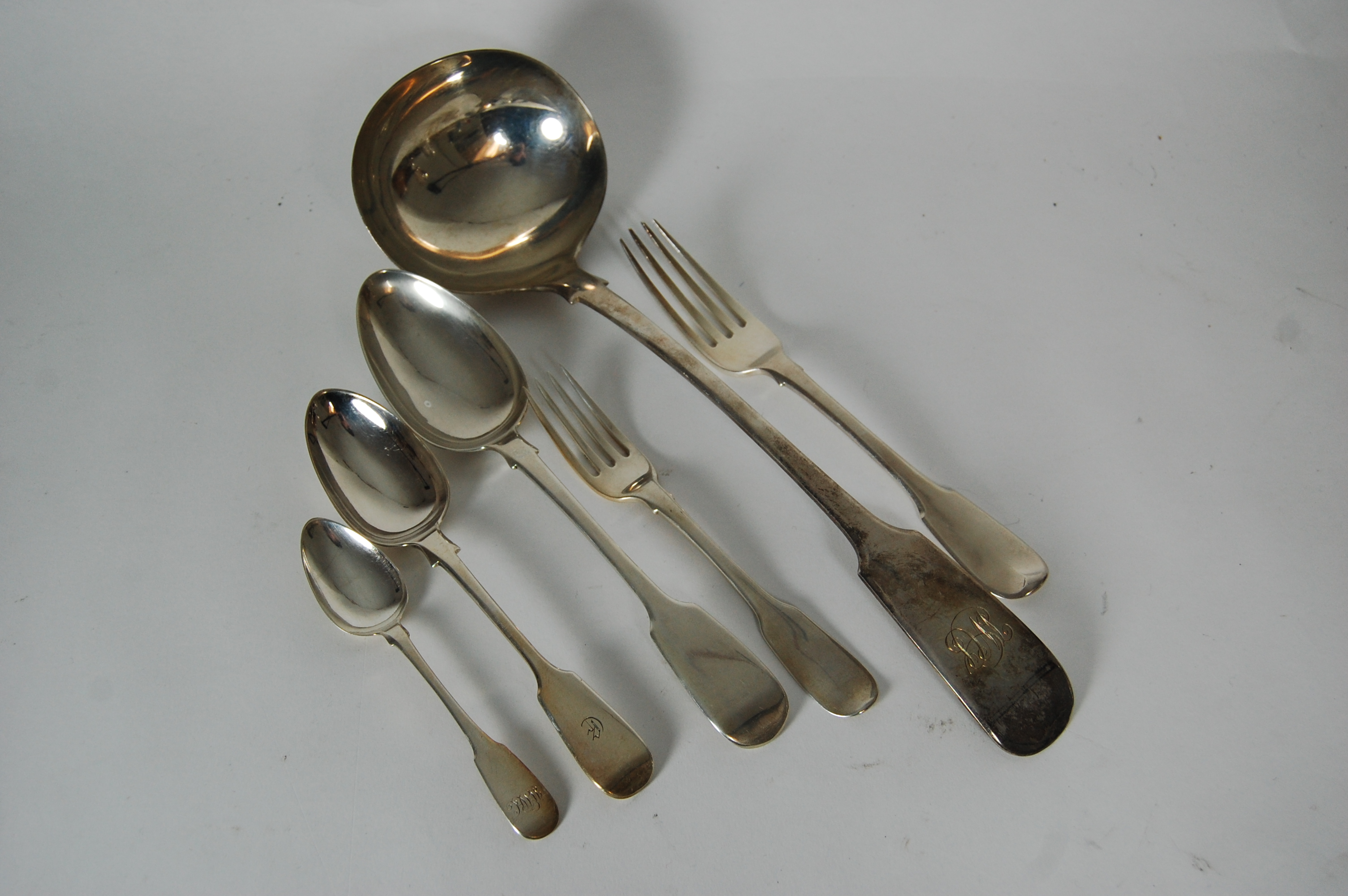 by various makers and dates, mainly London but some Edinburgh present, comprising table spoons, and forks, dessert forks and spoon, teaspoons, soup ladle; together with some ivorine handled knives and carvers; contained in a George III mahogany canteen on turned legs, with hinged top and drawer (qty)