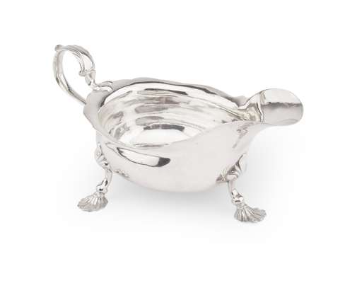 Richard Calderwood (possibly), Dublin circa 1740, the shallow body with everted scalloped rim and wide spout, with S scroll acanthus capped handle and raised on three shell terminal scroll legs, the base engraved with scratch weight 7-18