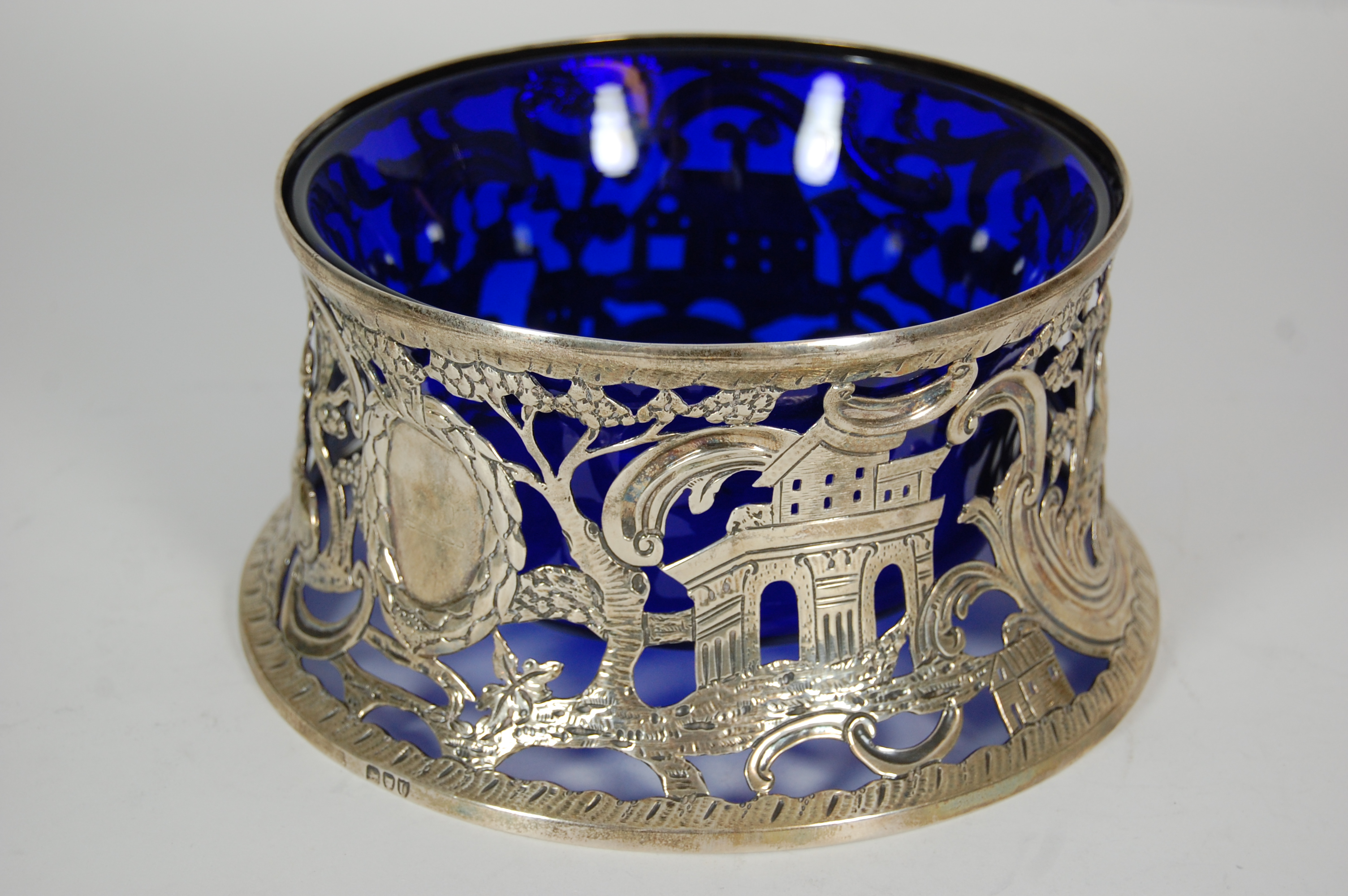 London 1895 (makers mark rubbed), of conventional form with pierced and embossed decoration of country scenes and figures, with wreath formed cartouche with crest engraved within, with later blue glass liner