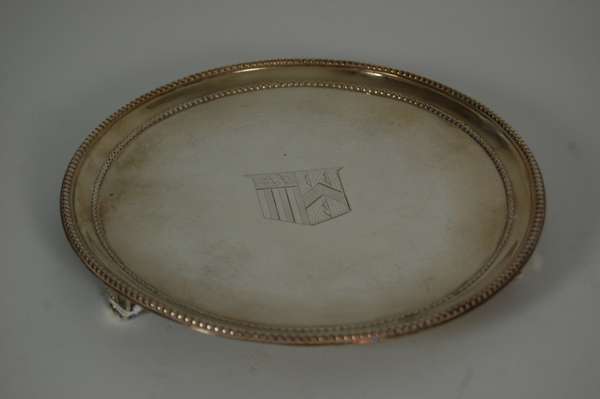 T Watson (possibly) London 1784, the circular tray with beaded rim and border, engraved to centre with armorial shield, raised on three simple beaded bracket feet