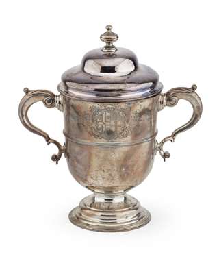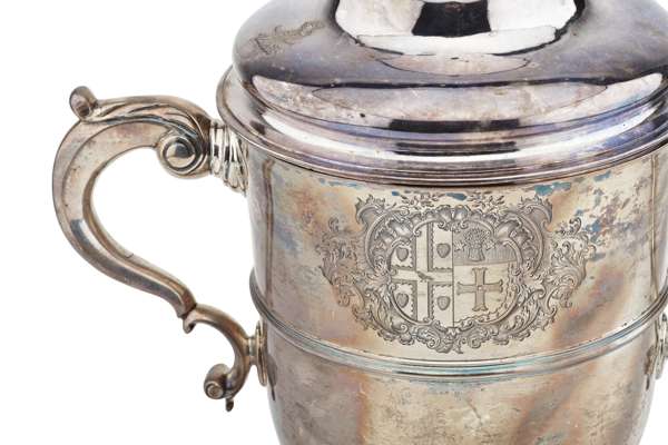 Richard Gurney & Co London 1746, the deep body with simple reeded girdle and engraved armorial with twin S scroll handles with leaf capping, raised on a simple domed spreading foot, the associated domed pull off cover with bun finial