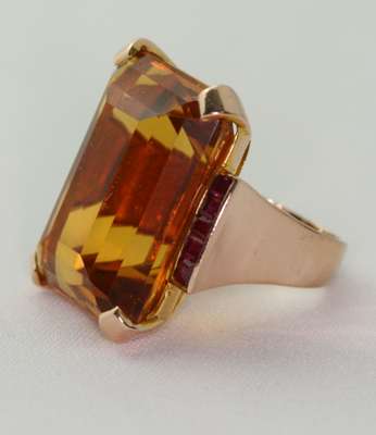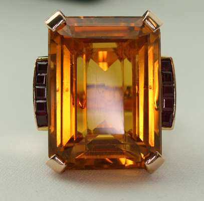 corner claw set to the centre with a large trap cut citrine, of a strong golden yellow hue, flanked to either side by channel set borders of calibre cut rubies