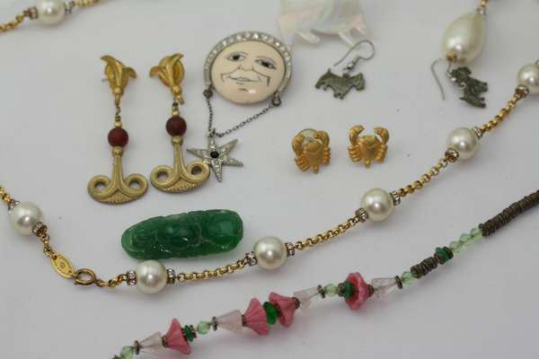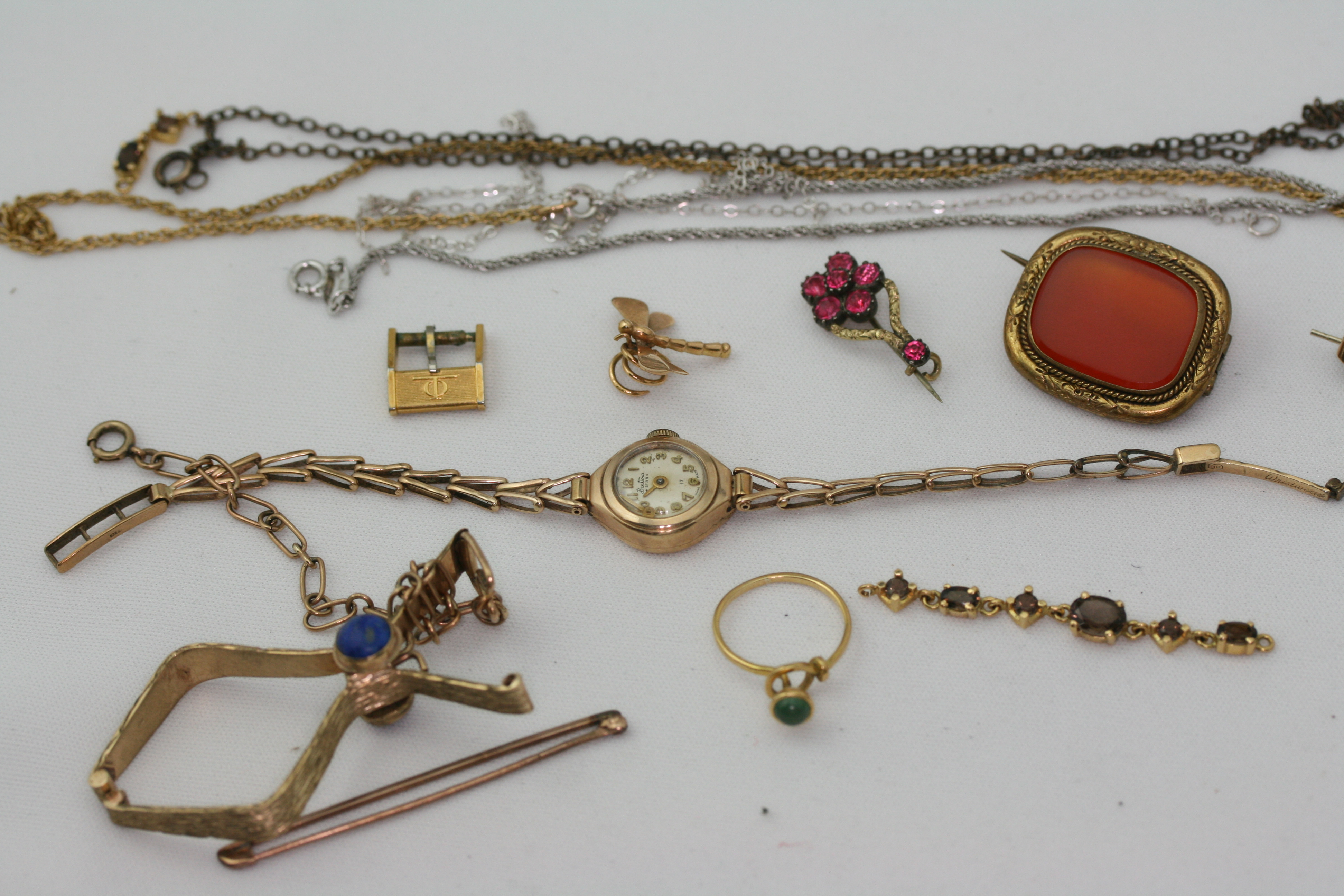 to include a lady's 9ct gold Bentima Star wrist watch; assorted chains and brooches; together with a collection of mostly costume jewellery to include a Chanel simulated pearl necklace and a Butler & Wilson moon and star form brooch (Qty)