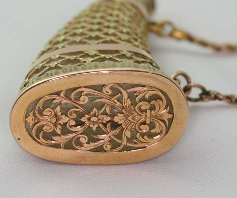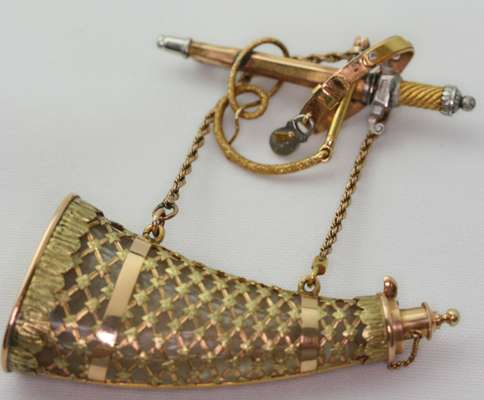 composed of a removable dagger with scabbard, padlocked and fastened belt and woven textured scrolling whip, surmounting two ropetwisted suspension chains and a two-coloured gold mounted rock crystal scent bottle designed as a powder horn, applied with lattice, stiff-leaf and foliate scroll decoration, with detachable stopper and safety chain