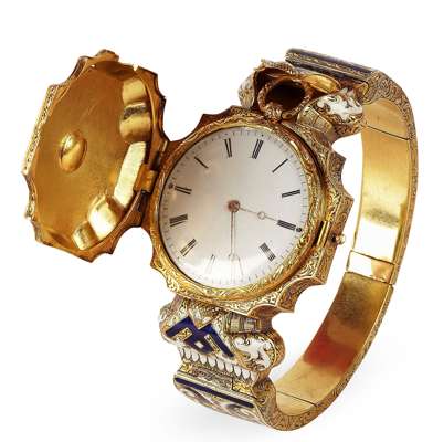 A 19th century French gilt and enamel hinged bangle with watch compartment