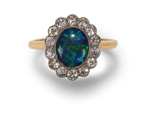 A black opal and diamond cluster ring