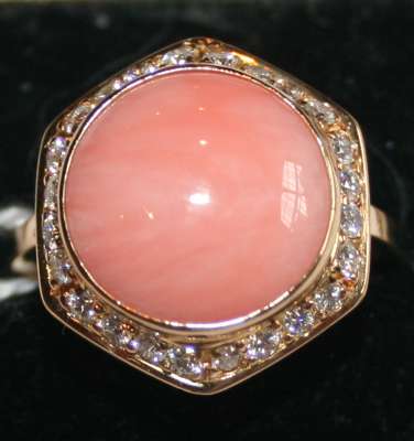 A modern pink coral and diamond set ring