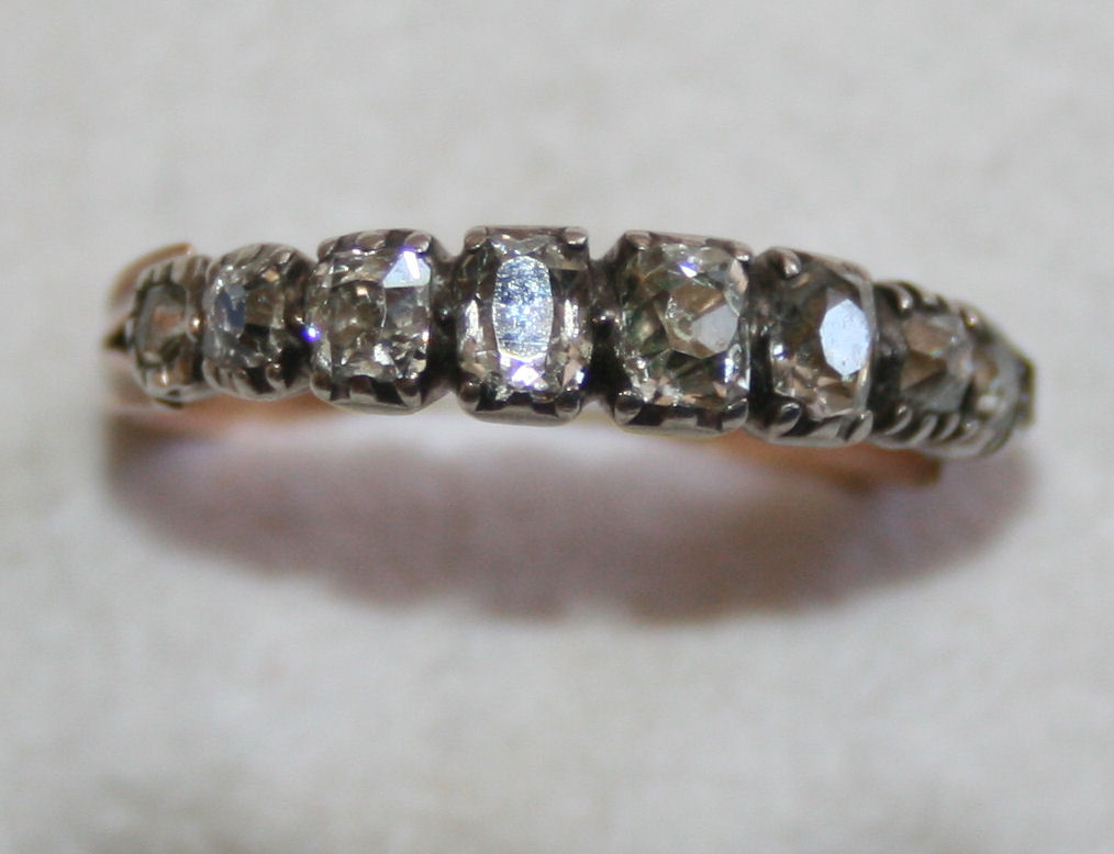 set with graduated old mine and rose cut diamonds, with closed back setting and bifurcated shoulders