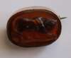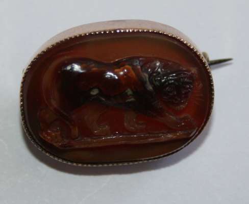 of shaped oval outline, millegrain collet set with a mottled brown oval cut hardstone panel carved with a prowling tiger